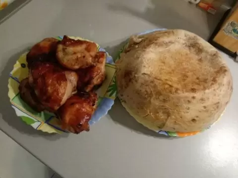В завершении повышаем огонь под казаном, чтобы подрумянить лаваш, который в данном контексте называется казмаг, а затем аккуратно переворачиваем на тарелку. К готовым куриным бедрам подаем рис с шафраном, создавая гармоничное сочетание, которое обязательно впечатлит ваших гостей.