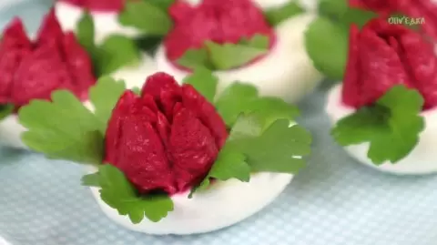 3. Формирование тюльпанов. Наполните яичные белки получившимся кремом с помощью кондитерского мешка, используя насадку «Тюльпан». Для добавления яркости и свежести можно украсить тюльпаны листиками петрушки, аккуратно прикрепив их зубочисткой.