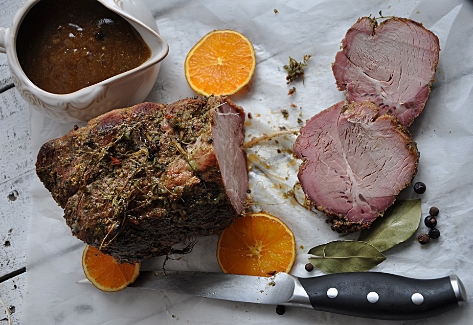 Затем форму ставят в разогретую до 160°C духовку и запекают без крышки в течение примерно часа. За полчаса до конца запекания свинину рекомендуется накрыть фольгой и увеличить температуру до 200°C. Проверить готовность можно, проколов мясо и оценивая прозрачность выделившегося сока.