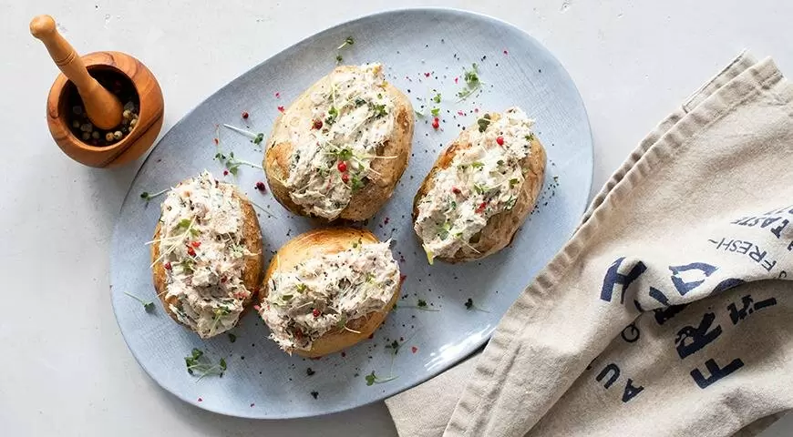 Это блюдо напомнит гурманам о фастфуде из печеного картофеля с разнообразными начинками, и перенесет вас в мир скандинавской кухни, где особенно ценится копченая рыба, горчица и ароматный укроп. Учитывая, что скумбрия обладает достойной жирностью, рекомендуется использовать натуральный йогурт в качестве заправки. Нежирная сметана также станет отличным дополнением.