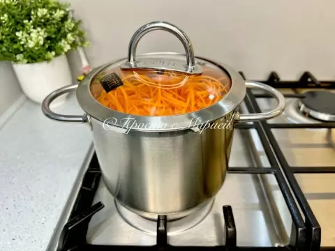После этого включается средний огонь, и закуска готовится под закрытой крышкой ровно 7 минут. За это время грибы выделят сок, а овощи удачно промаринуются. Как только время истекло, кастрюлю снимают с плиты, содержимое перемешивают и оставляют остывать. Закуску лучше убрать в холодильник на сутки, чтобы она полностью пропиталась вкусами.