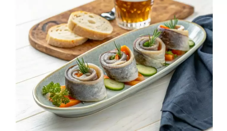 Рольмопсы представляют собой маринованную сельдь, завернутую в рулетики с разнообразной овощной начинкой. Это блюдо популярно в немецкой, латвийской и других европейских кухнях. Начинка может варьироваться, включая лук, морковь, корнишоны, яблоки и даже другие овощи.