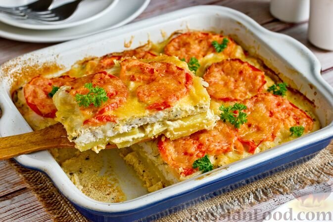 Картофельная запеканка с помидорами: Неизменно вкусная запеканка, пропитанная яично-сметанной заливкой, станет идеальным угощением как для семейного, так и праздничного стола.