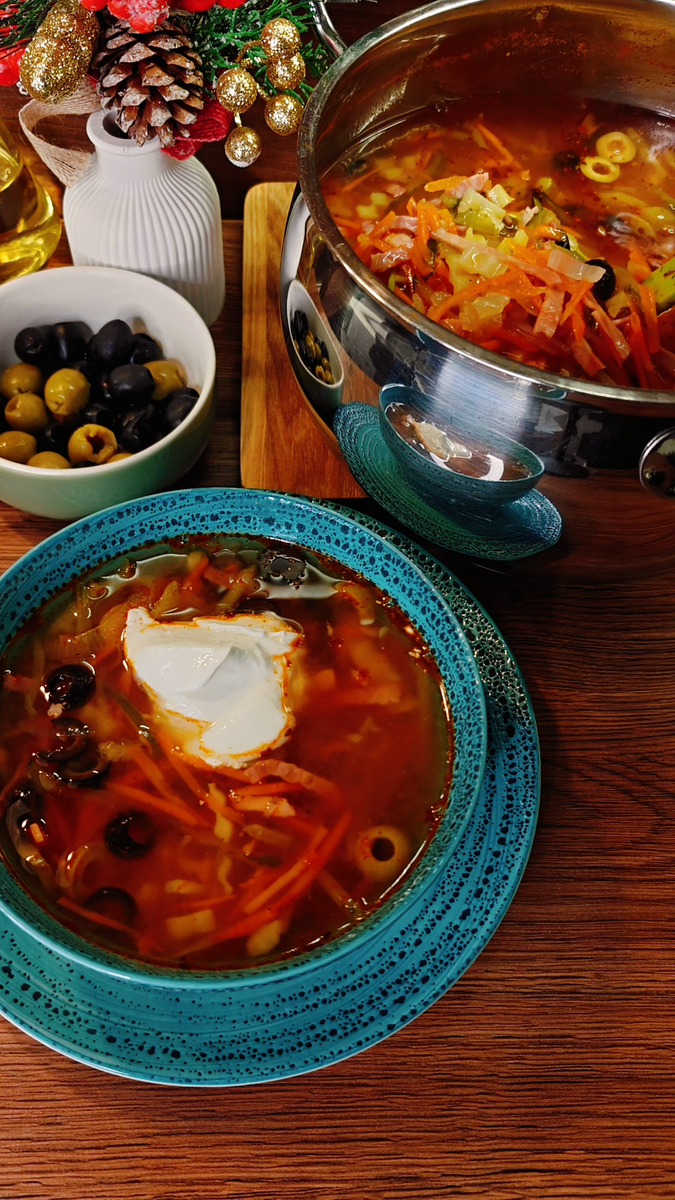 Этот суп, напоминающий солянку, сочетает в себе копчености и приятную кислинку от оливок, маслин и соленых огурцов. Рецепт не только прост в приготовлении, но и удивительно вкусен.