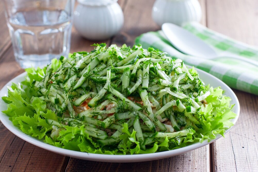 Салат отправляется в холодильник на 1,5-2 часа, а перед подачей поверхность огурцов немного посолите.
