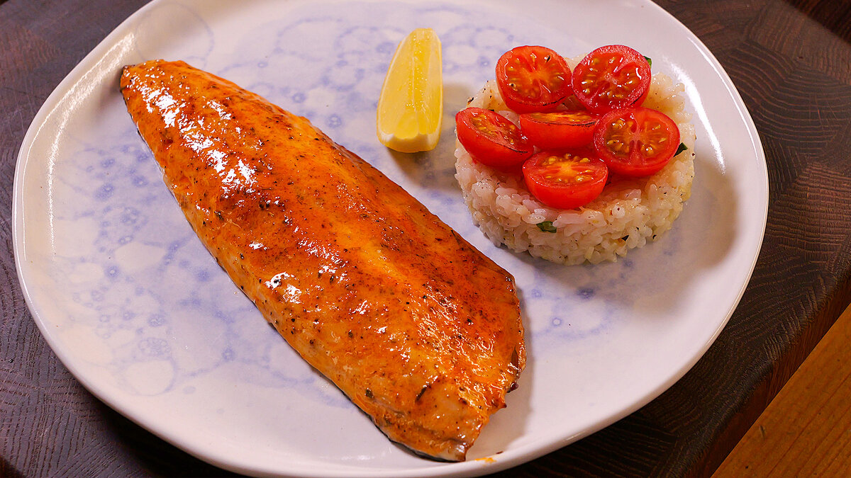Чтобы блюдо выглядело особенно привлекательно, обжарьте несколько томатов черри на газовой горелке и снимите с них кожицу. На красивую тарелку аккуратно выложите запеченную скумбрию, добавьте рис и украсьте очищенными томатами. Для закругления аромата можно также слегка поколдовать с газовой горелкой над рыбой — это добавит блюду незабываемого вкуса. Приятного аппетита!